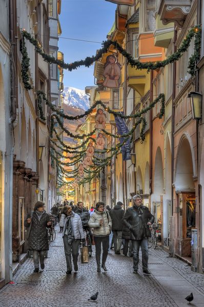 Il centro storico di Bolzano è praticamente in mano al commercio turistico: a farla da padroni sono ristoranti, bar, pub, tavole calde; seguono hotel e pensioni, quindi la vendita al dettaglio - le migliori boutique con le marche più prestigiose sono lì. Caratteristica del centro sono le famose "gallerie", vere e proprie autostrade pedonali a tre corsie - due laterali sotto i portici ed una centrale allo scoperto - che corrono parallele tra loro girando praticamente intorno alle due-tre piazze principali: Piazza Municipio, Piazza Walther e piazza Erbe. Particolare: le strade che si intersecano in questo triangolo assumono tutte il nome dagli antichi mestieri che qui venivano svolti; le stesse case (tutte di stampo austriaco con le caratteristiche balconate esagonali agli angoli) oggi quasi tutte ristrutturate e sedi di Università, banche, assicurazioni, prestigiose boutique eccetera, anticamente erano "casa, magazzino e bottega" dell'artigiano.